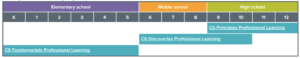 The CS Discoveries Professional Learning Program is for grades 6-10 teachers interested in “teaching a semester or full-year” of the CS Discoveries course (CS Discoveries Professional Learning Program, n.d.). Admission into the program requires an application process where workshop participants require acceptance. The program begins with a 5-day summer workshop where teachers learn the CS Discoveries curriculum (Computer Science Discoveries, n.d.) through hands-on activities. Teachers are then required to participate in 1-day quarterly workshops throughout the school year to support their teaching. The CS Discoveries Professional Learning Program is free and may provide travel and meal expenses on occasion.