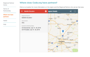Where does Code.org have partners?. (n.d.). Retrieved April 23, 2018, from https://code.org/educate/regional-partner/partners.