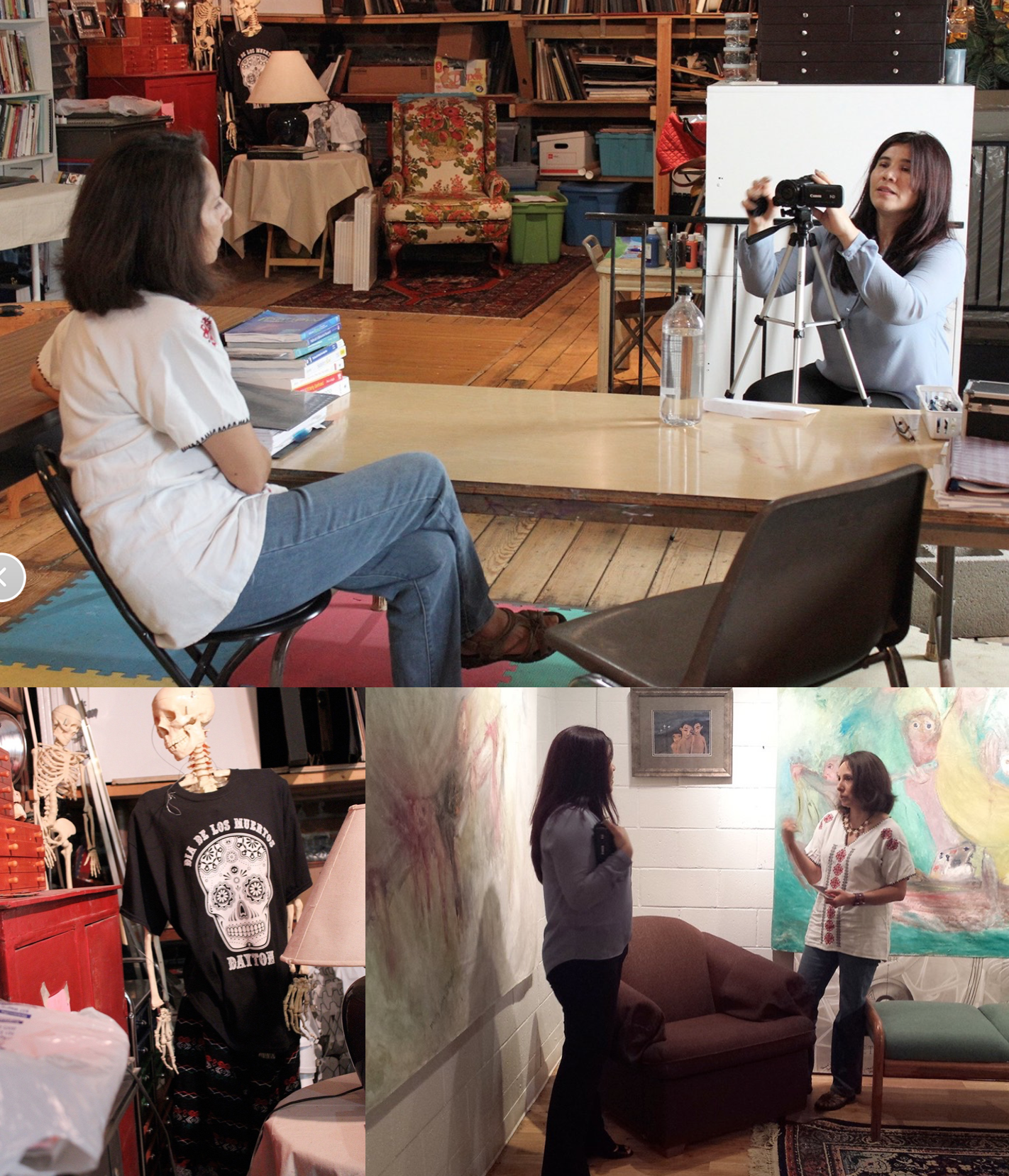 GP: Bueno, yo siempre había soñado con tener mi estudio y una galería de arte, ¿no? eso para mí nunca fue a lo mejor sin algún día, siempre decía, “Cuando yo tenga mi estudio” yo vivo a un lado de mi estudio, lo que pasa es que este edificio se puso en venta y era realmente horrible. Y tenía miedo consecuentemente que alguien lo comprara y lo abandonaran, etcétera. Entonces yo decidí renovarlo y ahora tengo mi estudio y mi galería. Esa es una de las piezas que hice en el 2012, justo cuando mi padre estaba enfrentando su propia muerte y realmente ni siquiera me di cuenta, en ese momento que la estaba pintando, pero realmente estaba yo pensado en esa, la eminencia, ¿no? de la muerte de nuestros seres queridos así fue como lo describí yo. Esto va a ser un paisaje que estoy haciendo. También para mí es muy importante recordar los, los paisajes de México, ¿no? Y esta es mi área de juego, vamos a decir. Podemos bajar. Aquí hay algunas cosas que tengo que uso para el desfile del Día de los Muertos. Nosotros venimos desde el centro de convenciones cerramos la calle quinta, y hacemos un desfile. Tenemos las gentes se pintan, se ponen máscaras, traen sus propios puppets y, realmente ha sido sorprendente de una manera, ha sido muy bonito, vamos a decir, que hay tanto interés por el Día de los Muertos, ¿no? En, en Dayton. Curiosamente el año pasado hubo gentes de doce diferentes países, gentes que vinieron de Arabia Saudita, de Jordania, de Palestina de Ruanda, de muchos lugares del mundo, y estaban aquí. Y algunos no sabían enteramente lo que era el Día de los Muertos, pero querían aprender, querían experimentarlo. Y ha sido muy bonito en ese sentido. La galería se llena de altares, para nosotros, los mexicanos el Día de los Muertos es una combinación de una tradición prehispánica con, con una tradición Católica que es el Día de los Santos Inocentes, más o menos coinciden. O sea que es una tradición sincrética donde se celebra la vida de los que ya se fueron y es una manera de nosotros, de volver de sentir la presencia de aquellos que se nos fueron, se ponen altares con sus fotos con algunas cosas que ellos disfrutaron en, en vida, inclusive comida, su cervecita, su tequilita, cafecito, mole, lo que sea, se ponen simbólicamente en una mesa con muchas flores cempasúchil que es la flor tradicional que es, está en cosecha en esa época, es la flor de temporada que tiene un color anaranjado muy, muy vivo por lo tanto, le da mucho color a los [altares], y las velas nunca pueden faltar las velas. La música y el festejo. Y eso lo que hacemos aquí. Se hacen altares a personas específicas, por ejemplo este año vamos a hacerlo a un maestro que falleció en una de las escuelas locales, y es una manera que los estudiantes van a celebrar su vida. Tiene mucho, tiene un valor para, para poder sanar las heridas y el dolor de haber perdido una persona muy importante, muy terapéutico también hacer un altar. Y también, por ejemplo, algunos tienen un toque sociopolítico, por ejemplo a veces se han hecho para aquellos soldados que han muerto en las guerras, ¿no? Los hombres y mujeres en Afganistán, en Iraq, que no tenían nada que ver con la guerra. Se hacen altar para ellos. Se han hecho altares, este año vamos a hacer altares para las víctimas que han caído por adicción de heroína, que es un problema muy, aquí en Dayton es un problema muy grave que tenemos. Para las víctimas de violencia de armas, también. En fin, eso es más o menos lo que hacemos.