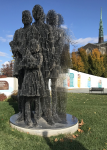 The Greater Columbus Arts Council commissioned a sculpture to focus on the shared values of fairness and unity, specifically to represent the quote, “Injustice anywhere is a threat to justice everywhere. We are caught in an inescapable network of mutuality, tied in a single garment of destiny. Whatever affects one directly affects all indirectly.”[1] The resulting sculpture, “Our Single Garment of Destiny,” created by Julian and Adriana Voss-Andreae in 2021, is visible from a major downtown street.